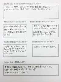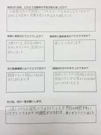 初めての事故だった為、事故後の流れや、自動車保険の内容、施術の方法など、分からないことだらけだった点が不安でした。